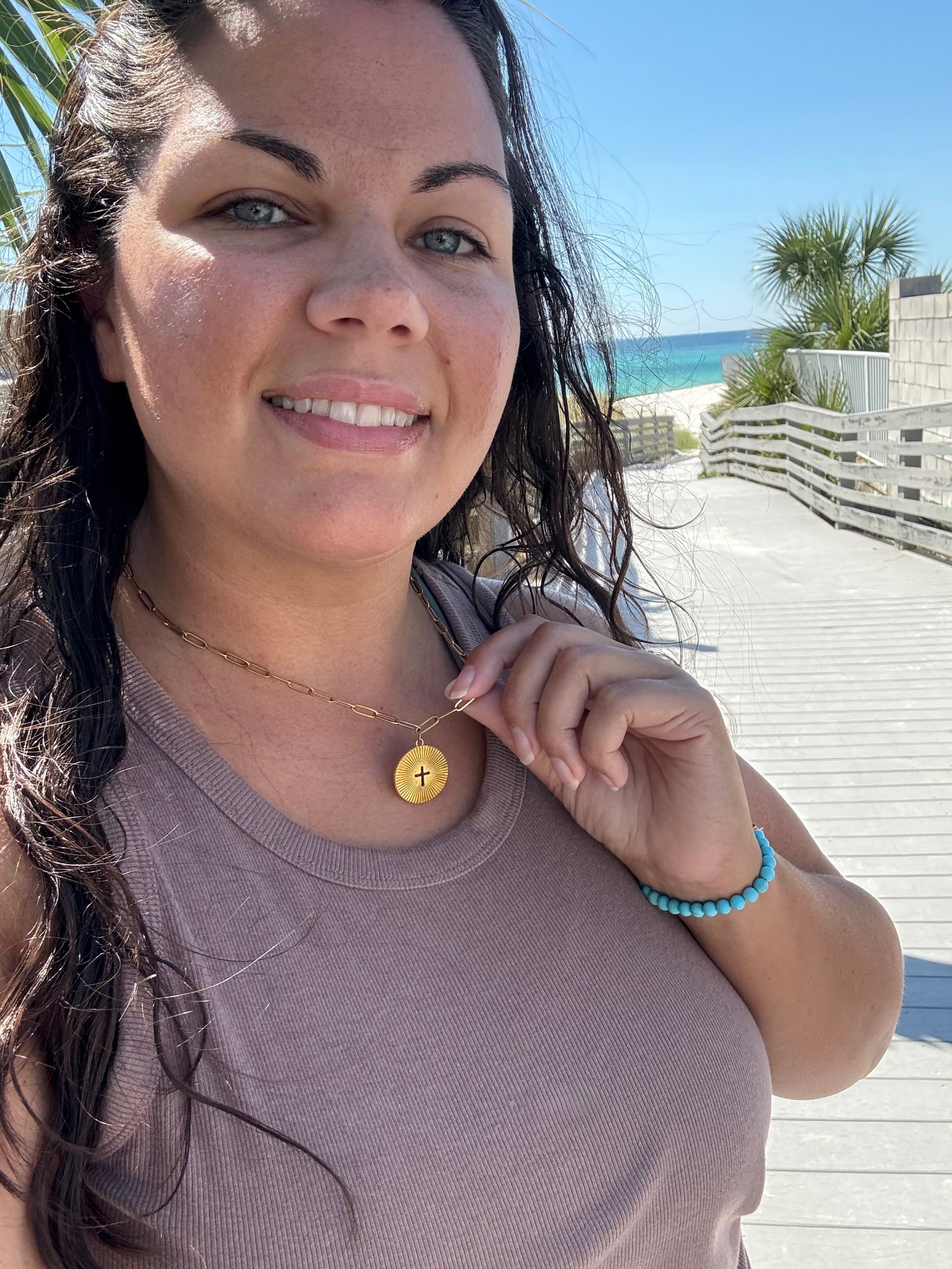 • Sun Burst Cross on beautiful 18k gold plated stainless steel or silver medallion.